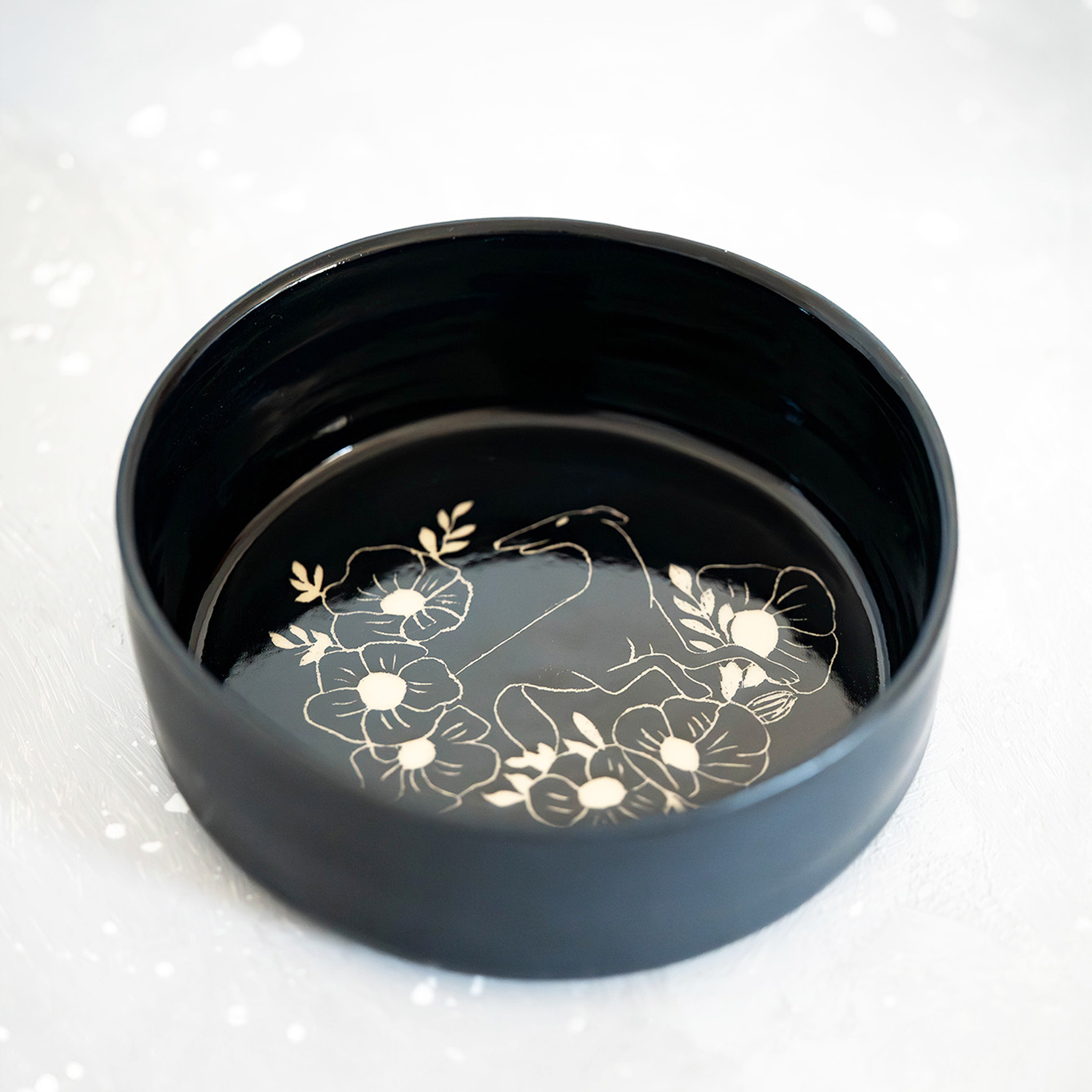 Na zewnątrz pokryta głębokim, satynowym szkliwem w odcieniu czerni, wewnątrz lśniąca czarna powierzchnia z subtelnym zdobieniem – chart wpleciony w delikatny kwiatowy motyw, który nadaje misce wyjątkowego charakteru i elegancji.